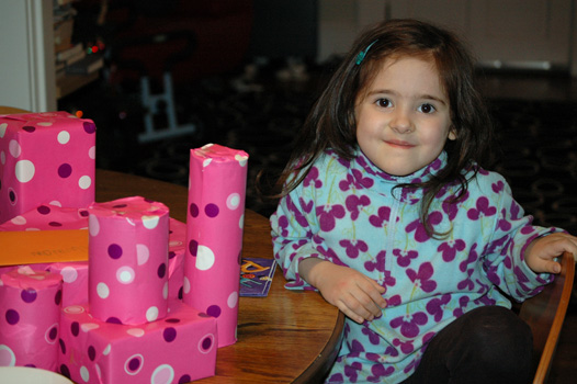 Mia! She waits patiently for Mom to open the presents she and Dad wrapped so beautifully and to read the card Mia made with such care.