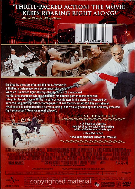 | Inspired by the story of a real-life hero, Fearless is a thrilling masterpiece from action superstar Jet Li. When an ill-advised fight destroys the reputation of a renowned martial arts champion (Li) and his family, his difficult path to redemption will bring him face-to-face with the most ferocious fighters in the world. Orchestrated by Yuen Wo Ping, the legendary chreographer of The Matrix and Kill Bill, this sensational, riveting epic is being described as "astounding" and visually stunning with brilliantly executed fight sequences" (Pete Hammond, Maxim). |
