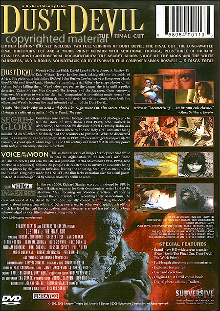 Dust Devil (1992) Wendy (Chelsea Field, David Lynch's Hotel Room, A Passion to Kill, Wicked) leaves her husband, taking off into the voids of Africa. She picks up a hitchhiker (Robert John Burke, Confessions of a Dangerous Mind, Good Night and Good Luck, Munich), a traveling serial killer who snaps photos of his victims before he kills them. Wendy does not realize the danger she is in until a police detective (Zakes Mokae, Gross Anatomy, Wes Craven's The Serpent and the Rainbow) arrives to warn her that her companion is something much worse then just a killer - he is a shape-shifting demon who steals his victim's souls. Soon both the officer and Wendy become the next intended victims of the Dust Devil... Secret Glory (2001) Combines rare archival footage, old letters, and photographs to tell the story of Otto Rahn (1904-1939), who worked in Ahnenerbe, a Schutz-Staffel division in nazi Germany. Rahn was convinced he knew where to find the Holy Grail and, after being nominated an SS officer, he finally had the resources to pursue it. What he discovered remains as mysterious as his untimely death in 1939. "Stanley manages to conjure up the vision of a grand quest, which began in the 13th century and hasn't lost its alluring power until today." - Oldenberg Film Festival website. Voice of the Moon (1990) This 30-minute series of images Stanley recorded while he was in Afghanistan in the late 80's with some Mujahadin rebels (and also the late war journalist Carlos Mavrolean (1958-1998), who turn to pieces by the Russian invasion. During the shooting, Stanley also encountered the Taliban. Originally made for UNICEF, the film lacks narration save for a Sufi poem. instead, it is accompanied by Simon Boswell's brilliant score. The White Darkness (2002) In the year 3000, Richard Stanley was commissioned by BBC to film a Haitian segment for their documentary series Last of the Medicine Men, focusing on Voodoo practices. Wandering around the countryside and recording their observations, the crew witnessed at first hand that "voodoo," usually coined re-animating the dead, is mostly about interacting with and being possessed by otherworld spirits, a tradition which has lived through the occupation and missionary eras and has just recently been acknowledged as a certified religion among others. |