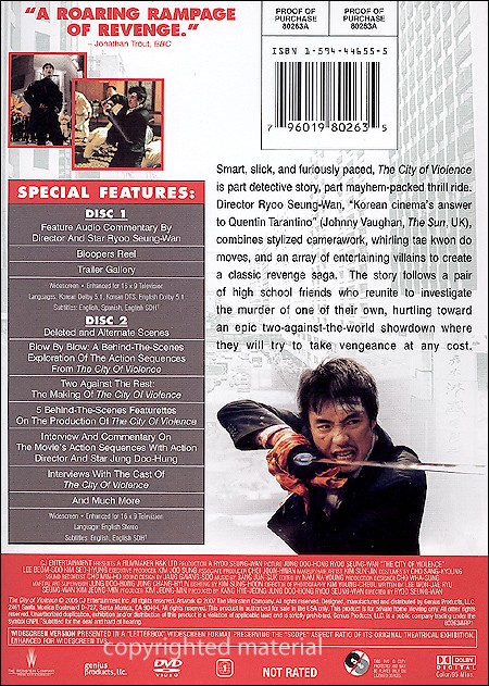 | Smart, slick, and furiously paced, The City Of Violence is part detective story, part mayhem-packed thrill ride. Director Ryoo Seung-Wan, "Korean's cinema's answer to Quentin Tarantino" (Johnny Vaughan, The Sun, UK), combines stylized camerawork, whirling tae kwon do moves, and an array of entertaining villains to create a classic revenge saga. The story follows a pair of high school friends who reunite to investigate the murder of one of their own, hurtling toward an epic two-against-the-world showdown where they will try to take vengeance at any cost. |