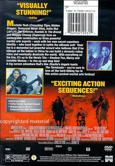 Michelle Yeoh (Crouching Tiger, Hidden Dragon; Tomorrow Never Dies), Anita Mui (Jet Li's The Enforcer, Rumble In the Bronx) and Maggie Cheung (Supercop) form an unstoppable combination as three powerful martial arts experts-each with her own secret superhero identity-who band together to battle the ultimate evil! Their foe is a demented but powerful wizard who believes that if he kidnaps all the babies in China he can build a demonic ruling class and eventually dominate the world. With everything on the line, it's up to the Heroic Trio-Shadow Fox, Mercy and Invisible Woman-to rise up and stop him!