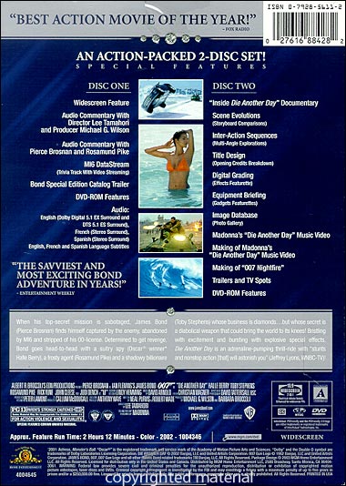 When his top-secret mission is sabotaged, James Bond (Pierce Brosnan) finds himself captured by the enemy, abandoned by M16 and stripped of his 00-license. Determined to get revenge, Bond goes head-to-head with a sultry spy (Oscar winner Halle Barry), a frosty agent (Rosamund Pike) and a shadowy billionaire (Toby Stephens) whose business is diamonds...but whose secret is a diabolical weapon that could bring the world to its knees! Bristling with excitement and bursting with explosive special effects, Die Another Day is an adrenaline-pumping thrill-ride with "stunts and nonstop action [that] will astonish you" (Jeffrey Lyons, WNBC-TV)! |