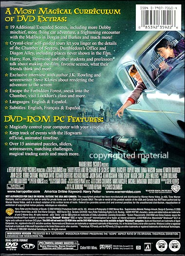 19 Additional/Extended Scenes Crystal-Clear Self-Guided Tours of the Chamber of Secrets, Dumbledore's Office and Diagon Alley Harry, Ron, Hermione and other students and professors talk about making the film, favorite scenes, and what their friends think and more. Exclusive interview with author J.K. Rowling and screenwriter Steve Kloves Escape the Forbidden Forest, Sneak Into the Chamber, Visit Lockhart's Class and More DVD-ROM PC Features: Magically Control Your Computer With Your Voice Keep Track of Events With the Hogwarts Official, Animated Timeline Over 15 Animated Puzzles, Sliders, Screensavers, Matching Challenges, Magical Trading Cards and Much More