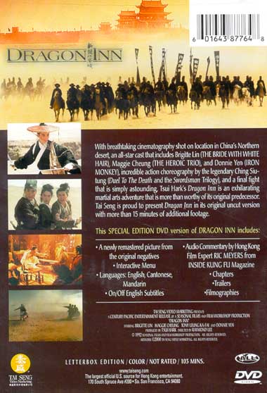 With breathtaking cinematography shot on location in China's Northern deset, an allstar cast that includes Brigitte Lin (The Bride With White Hair), Maggie Cheung (The Heroic Trio), and Donnie Yen (Iron Monkey), incredible action choreography by the legendary Ching Siutung (Duel To The Death and The Swordsman Trilogy), and a final fight that is simply astounding, Tsui Hark's Dragon Inn is an exhilarationg martial arts adventrue that is more than worthy of its original pedecessor. Tai Seng is proud to present Dragon Inn in its original uncut version with more than 15 minutes of additional footage. |