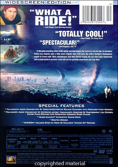 In this pulse-pounding action-thriller, global warming triggers the onset of a new Ice Age. As tornadoes flatten Los Angeles, a tidal wave engulfs New York City and the entire Northern Hemisphere begins to freeze solid. Now, climatologist Jack Hall (Dennis Quaid), his son Sam (Jake Gyllenhaal) and a small band of survivors must ride out the growing superstorm and stay alive in the face of an enemy more powerful and relentless than any they've ever encountered: Mother Nature! |
