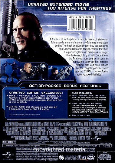 A frantic call for help from a remote research station on Mars sends a team of mercenary Marines into action. Led by The Rock and Karl Urban, they descend into the Olduvai Research Station, where they find a legion of nightmarish creatures, lurking in the darkness, killing at will. Once there, the Marines must use an arsenal of firepower to carry out their mission: nothing gets out alive. Based on the hugely popular video game, Doom is an explosive action-packed thrill ride! |