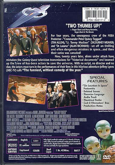 Now, twenty years later, aliens under attack have mistaken the Galaxy Quest television transmissions for "historical documents" and beamed up the crew of has-been actors to save the universe. With no script, no director and no clue, the actors must turn in the performances of their lives in this hilarious adventure Jeffrey Lyons (NBC-TV) calls "The funniest, wittiest comedy of the year." |